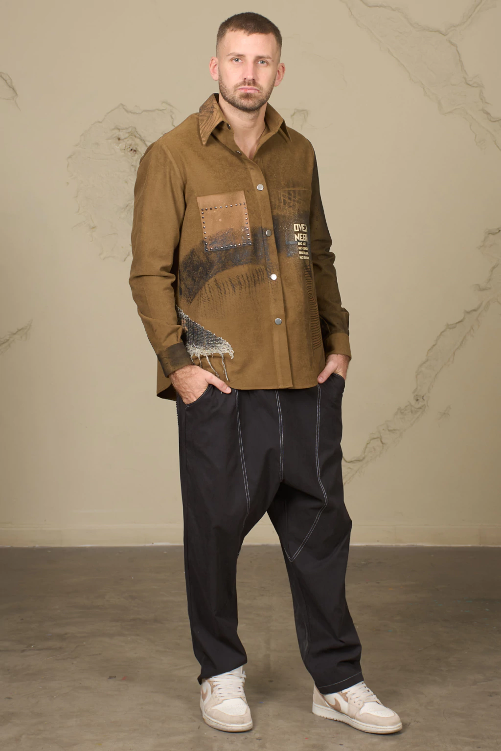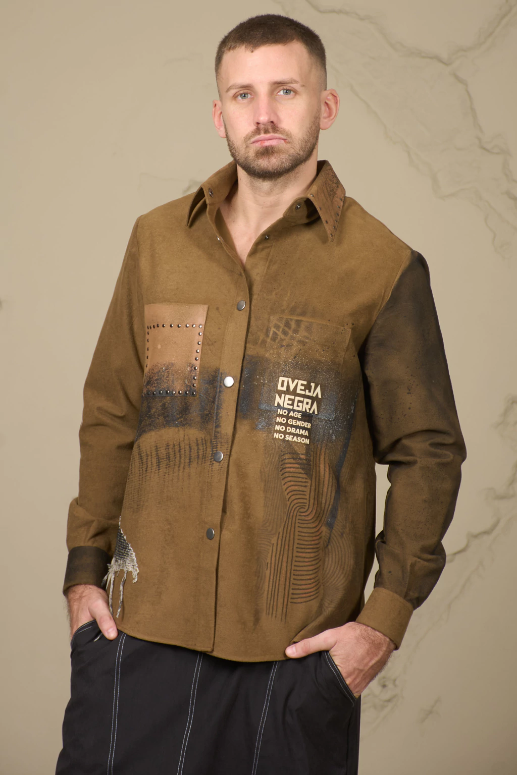 Cuello con sello de simil nervaduras de hojas y manchones negros esfumados. Delantero derecho: bolsillo aclarado con tachas redondas siguiendo las líneas de costura, parche de rejilla engomado en el lateral que sigue hasta la espalda. Franja negra curva que atraviesa los dos delanteros . Delantero izquierdo: vinilo "ON" beige sobre y debajo del bolsillo. Dibujo simil huella digital que va hasta la espalda. Puño derecho y manga izquierda oscurecidos con negro esfumado. Atras: sobre el canesú, engomado parcial, vinilo circular, "ON" negro, mas glitter. Debajo escritura en cursiva finita con negro.