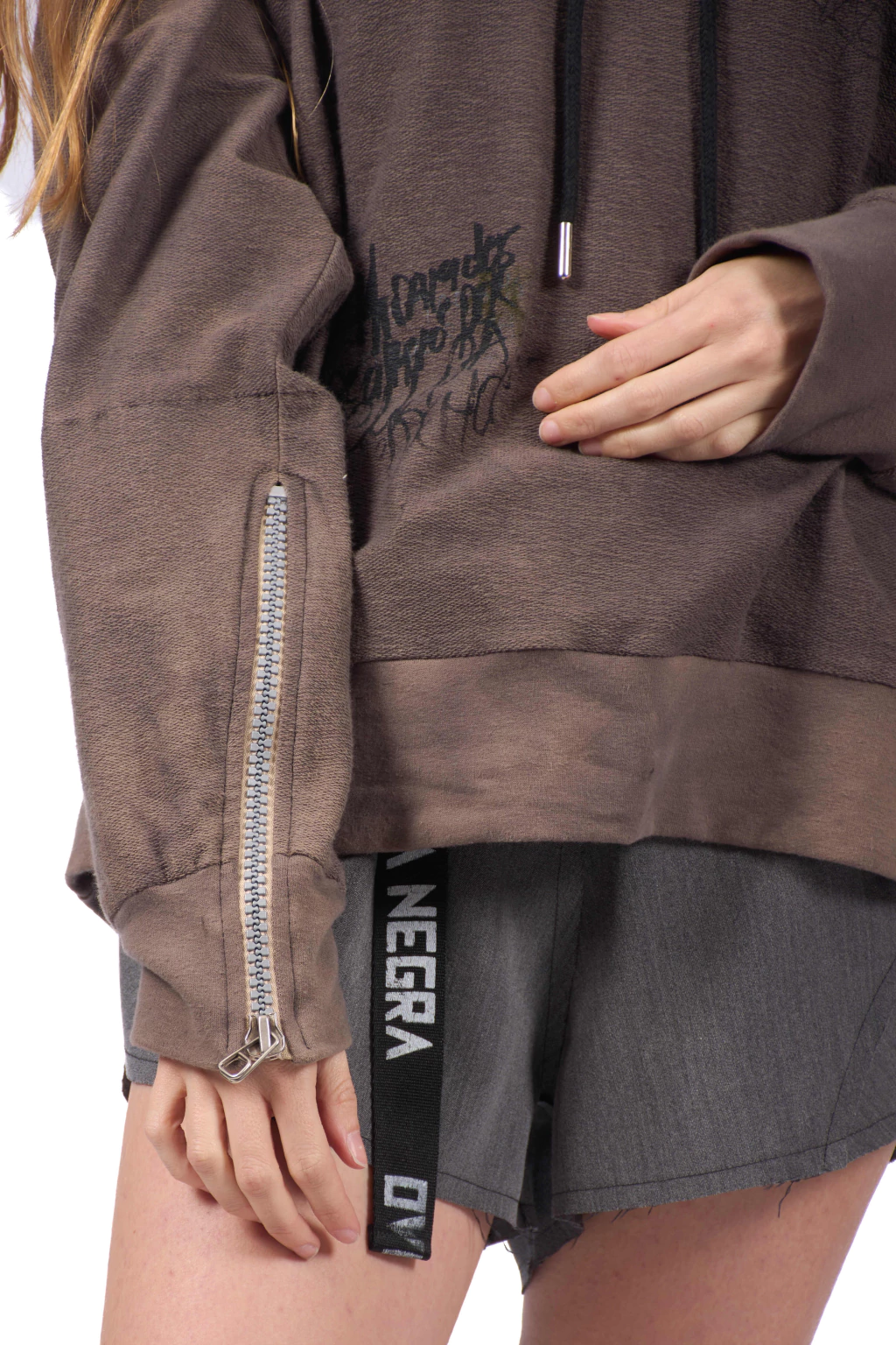 Hoodie gris amarronado, talle único. Tiene capucha forrada con tela azul sublimada, cordón negro y cierres en las mangas. Posee estampas con garabatos, escrituras en negro y detalles en verde. Etiqueta de goma "frase ON" negra letras blancas.
